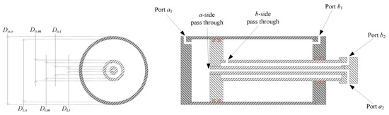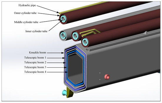 A model of the crane containing the hydraulic system, main boom, and knuckle boom was previously created using Simscape™ components; see [23,24,25]. For this paper, the telescopic actuation system is modeled and added to the Simscape model. A section view from the CAD model is given in Figure 17, showing how the telescopic booms are packed inside each other, as well as showing the unique telescopic cylinders. An illustration of a telescopic cylinder is given in Figure 18, showing how the three tubes are used to transport the fluid through the telescopic system. The associated diameters D and stroke length h are given in Table 5. Note that refers to the inner diameter of the middle tube, etc.
