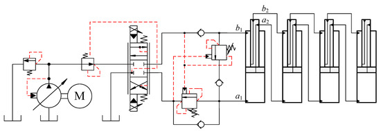 The hydraulic system for the telescopic cylinders is shown in Figure 19. The counterbalance valve is a special recirculating type, which effectively connects the a-side and b-side to the same pressure during the out-stroke motion. The workings of the telescopic circuit are shown in detail in Figure 20. Since the outer diameter of the middle tube is larger for cylinders 1 and 2, they have a smaller b-side area and will start moving first. The counterbalance valve has a rated flow of 70 L/min, and a pilot area ratio of 4. The directional control valve has a rated flow of 40 L/min.