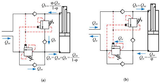 Flows in the telescopic circuit. (a) Flows in the telescopic circuit during out-stroke motion. (b) Flows in the telescopic circuit during in-stroke motion.