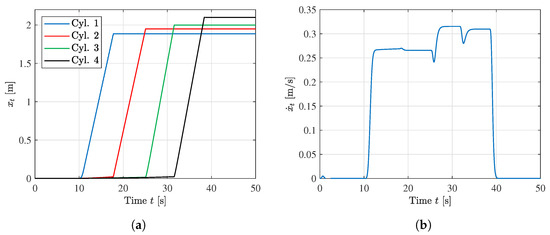 Motion sequence and velocity of the telescopic cylinders. (a) Position of each telescopic cylinder. (b) Velocity of the full telescopic system.