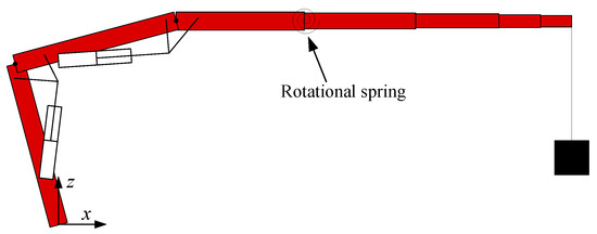 To verify the performance and feasibility of the static and dynamic deflection compensator, simulations are performed in the MATLAB Simulink® environment. A simplification of the flexibility is made by placing a rotational spring between the knuckle boom and first telescopic boom, illustrated in Figure 22. A similar approach was used in [26]. The deflection on the physical crane is due to many factors, such as structural flexibility, deformation of the sliding blocks between the booms, slack between the booms, and compression of the liquid in the cylinders. As such, an accurate model corresponding to the measured data is difficult to create, which is why a neural network is used to estimate the deflection in the first place. The purpose of the simplified model is to give the crane model an approximate static and dynamic deflection on which the developed compensator will be tested. Note that the neural network is simply re-trained to fit the measurements from the Simscape model in this section.