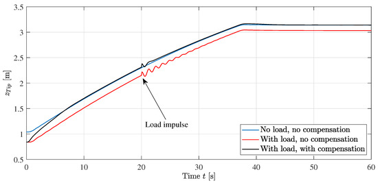 In the simulations, the crane is running path control, developed earlier in [22]. Three simulations are performed, one without load, one with load, and one with load and deflection compensation. A load impulse is done at s. The crane is moving from to . Figure 23 shows the vertical position during simulations, as the deflection is largest in the z-direction. It can be seen that the static deflection is compensated for after 6 s. The dynamic deflection compensator quickly dampens the oscillations induced by the load impulse.