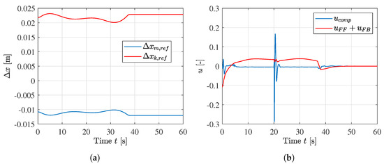 Effects of the static and dynamic deflection compensator. (a) Change in cylinder position reference from the static deflection compensator, (b) control signal from the dynamic deflection compensator , and motion controller .