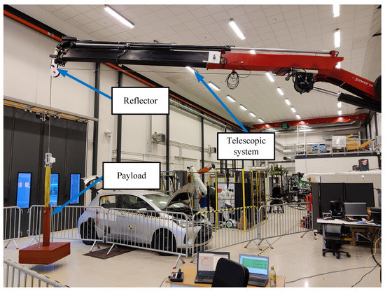 Experiments are conducted in the laboratory using a laser tracker, namely a Leica Absolute Tracker AT960. The laser tracker measures the position of a reflector mounted on the crane tip. A 581 kg payload is connected to the winch on the crane, and by measuring the crane tip position with and without the payload, the deflection of the crane tip is effectively measured. The setup in the laboratory is shown in Figure 4. Note that 581 kg was the heaviest payload that the crane could consistently lift at this boom length and pressure level available in the laboratory.