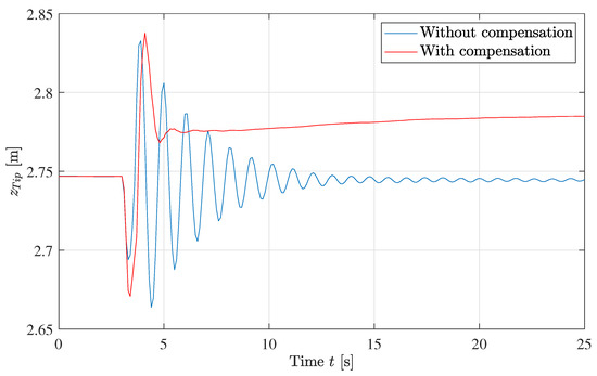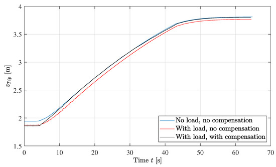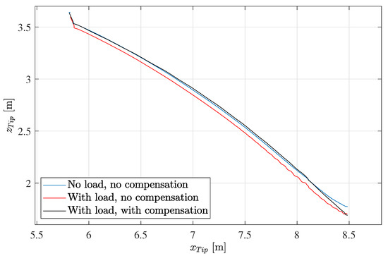 The crane moves from to while using the path controller. The path is run three times, one without load, one with load, and one with load and deflection compensation. A plot of the tip position in the -plane is shown in Figure 26, while the z-position versus time is shown in Figure 27. It can be seen that the compensator is able to compensate for the static deflection almost completely, in addition to removing the oscillations at the start and end of the motion. At the end of the path, the static deflection of the vertical coordinate of the crane tip, , is reduced from 56.8 mm to 5.7 mm, a 90% decrease.