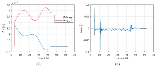 Effects of the static and dynamic deflection compensator in laboratory. (a) Change in cylinder position reference from the static deflection compensator. (b) Control signal from the dynamic deflection compensator.