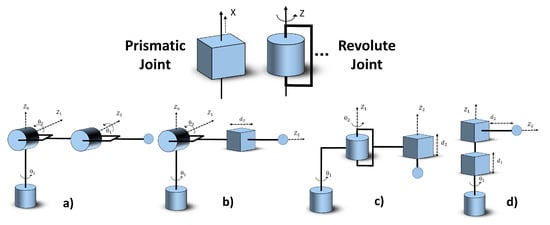 To curb the complexity of devising such transformation matrices for a multi-faceted manipulator, Denavit–Hartenburg [] parameters are used, which stipulate that any serial manipulator can be described as a kinematic model by specifying four parameters for each link: length of the link, twist of the link, offset of the link, and angle of the joint.