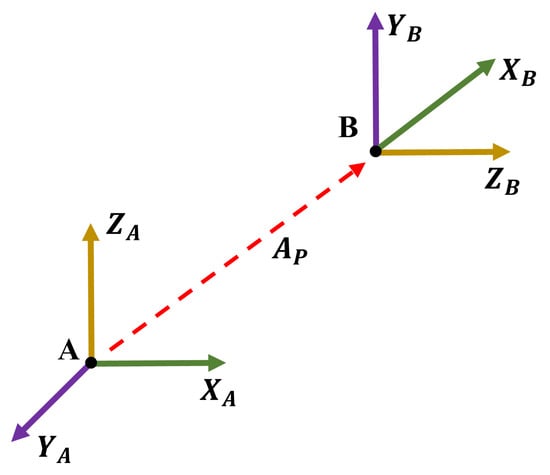 Frame transformation: frame A is translated along AP and rotated along one of the axes to produce frame B.