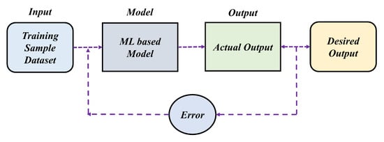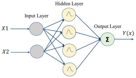 Linear Function (LF), Threshold Function (TF), Sigmoid Function (SF), and Radial Basis Function (RBF) are four types of transfers or activation functions []. RBFs are a type of activation function that consists of a collection of basis functions, one for each dataset. RBF takes the following broad form, as depicted in Equation (5):