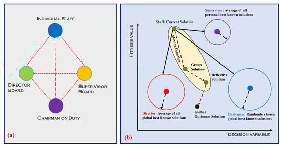 The model of an enterprise is mimicked and inspired by the Cooperative Search Optimisation Algorithm (CSOA) [], in which the staff represents the solutions and the performance of every staff member represents the fitness function value. The sketch of a team relationship is shown in Figure 6. Personal best solutions can be represented as the board of supervisors while the board of directors represents the number of global best solutions. Chairmen can be selected from the board of directors. The position updates of particles for high-quality solutions utilise different operators. The detailed mathematical model of CSOA is presented below, in the form of different stages.