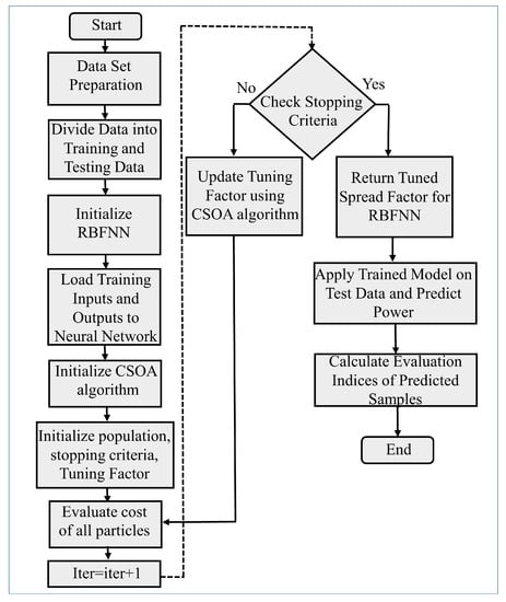 RBFNN suffers from low prediction accuracy if the parameters, i.e., the smoothing parameter with the number of neurons in RBFNN, do not tune well. For effective training and testing, these parameters need to be optimally tuned. In this paper, CSOA is used to tune these parameters, and forward kinematic prediction is performed. The flow chart for the training of RBFNN using CSOA is shown in Figure 7. Trained models are then tested on the test data and the performance evaluation is performed.