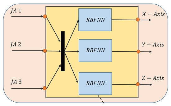 The smoothing parameter is an important parameter to tune in RBFNN, which is condnucted by the CSOA. In this work, three different RBFNN networks are used for the prediction of each axis position. So, the smoothing parameter needs to be tuned for each axis dataset. The structure of the RBFNN used for the prediction of forward kinematics is shown in Figure 8. The cost function used is the Normalised Mean Square Error (NMSE).