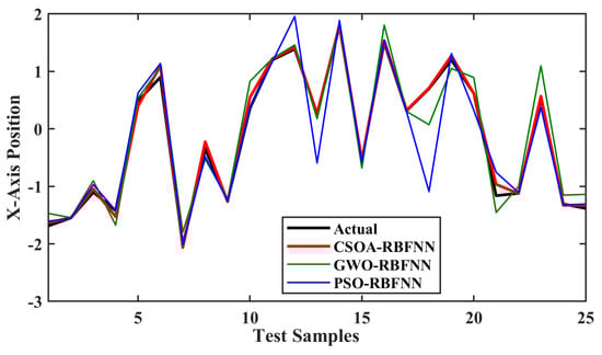 Comparison of actual x-axis position and predicted position from the meta-heuristic RBFNN models.