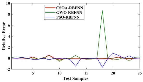 In regression problems, the relative error, Normalised Mean Square Error, and the Mean Absolute Error are the best indices to measure the performance of the prediction. Figure 9 shows the comparison of predictions of the x-axis position, while the relative error comparison is shown in Figure 10. The prediction curve shows that CSOA-RBFNN has better prediction accuracy than GWO-RBFNN and PSO-RBFNN. The relative error curve comparison also shows that the CSOA-RBFNN has a value close to zero, which is less than GWO-RBFNN and PSO-RBFNN.