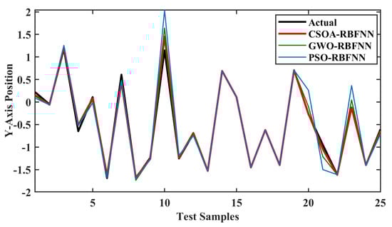 Figure 11 shows the comparison of predictions of the y-axis position, while the relative error comparison is shown in Figure 12. The prediction curve shows that CSOA-RBFNN has better prediction accuracy than GWO-RBFNN and PSO-RBFNN. The relative error curve comparison also shows that the CSOA-RBFNN has a value close to zero, which is less than GWO-RBFNN and PSO-RBFNN.
