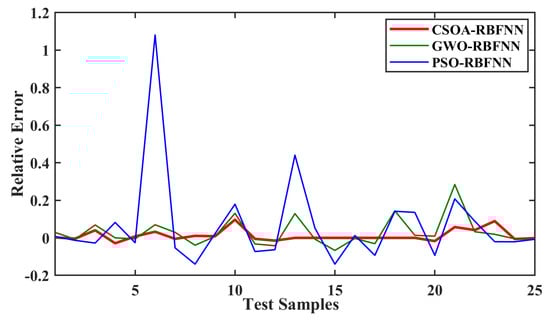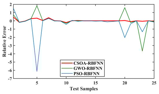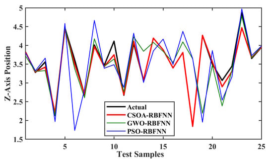 Figure 13 shows the comparison of predictions of the z-axis position, while the relative error comparison is shown in Figure 14. The prediction curve shows that CSOA-RBFNN has better prediction accuracy than GWO-RBFNN and PSO-RBFNN. The relative error curve comparison also shows that the CSOA-RBFNN has a value close to zero, which is less than GWO-RBFNN and PSO-RBFNN.