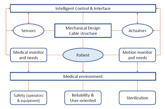 Figure 2 presents a conceptual scheme summarizing how the above problems and requirements can be considered and indeed implemented in a device for limb motion assistance by considering the general aspects, for which the specific attention to COVID disease can be considered a reinforcement of those requirements. In particular, Figure 2 is supposed to express the strong relationship between the device and the medical environment, as with the peculiarities of the COVID disease, may impose on the technical solutions by still considering the patient the center of the device purposes. The unique requirements of those assisting medical devices for COVID-19 patients are discussed by referring to Figure 1 and Figure 2 by indicating the additional problems and requirements for those systems when they should be used by/for COVID-19 patients. Those aspects refer mainly to sanitarian and disinfection issues, telemonitoring capability of the exercising activity, and flexibility for automatic of controlled operation depending on the status of the user-patients.