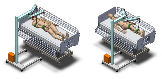 The above examples of motion assisting devices can suggest a successful adaptation and combination of existing solutions for application in home and hospital environments by addressing proper design and operation problems coming from the specific requirements for COVID-19 patients. A suitable system can be designed based on the prototypes of the above-mentioned previously developed solutions in a CADEL (cable driven elbow assisting device) cable device for arm joint rehabilitation and a NERI robot system with cables for arm rehabilitation with tower support, as shown in Figure 3. The system can be defined as an assembly and improvement of the two previous prototypes by providing a single system that can still carry out cable-driven rehabilitation functions of parts of the body of a COVID patient on the intensive care bed without any reactivity, and for COVID patients in sub intensive care, up to even home recovery with self-exercising.
