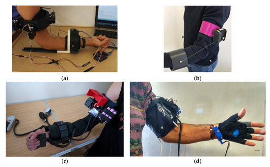 In some cases, the experimental test validation experiments were carried out by making use of artificial arms with a robotic structure with joint motion simulation in order to also investigate the possible interaction with further motor assistance systems, as in the specific case of the prototype developed at the University of Padova.