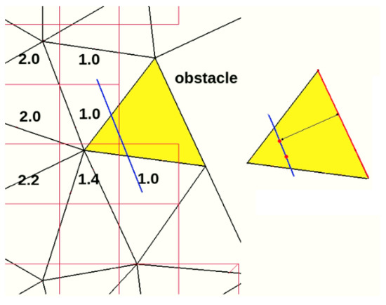 In triangular representation, as shown in Figure 1, there are some free points near obstacles that are not placed inside any cells in the . In this situation, the Euclidean distance between the point and other nodes and edges, which are tagged as the obstacle, is calculated. Then, the minimum value is returned as the minimum distance. This value may be smaller and larger than the previous distance value of the path and must be compared to the current minimum distance.