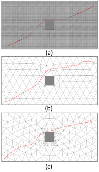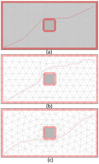 Different paths for a fixed scenario in an environment according to different representations. (a) A GRID 200 × 100. (b) An ITM-700. (c) A VITM-100-700.