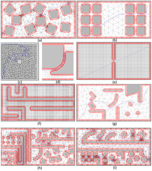 Different paths for some environments. (a) Blue path for Map_10-VITM-30-700. (b) Blue path for Map_8-100-700. (c) Blue path showing the capability of ITM in a maze map. (d) Blue path passing a narrow curvilinear passage by VITM method. (e) Blue path for a narrow passage by GRID 120 × 60 (f) Path in the corridor by GRID 160 × 80 (g) Representation ITM-700 with the generated path on a wide hybrid map (h,i) Two hybrid-narrow-passage environments with VITM representation.