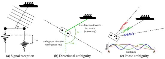 Two sensors (black circles) on a single robot receive an incoming signal emitted by an external source (ship), at an angle . In (a), the signal is first received by the right-most sensor and then by the left-most one after a delay of , which can be used to estimate the angle in (b). Phase ambiguities are related to the sensor separation, as shown in (c) where the phase lines show how all three signals can result in the same phase difference for the two sensors.