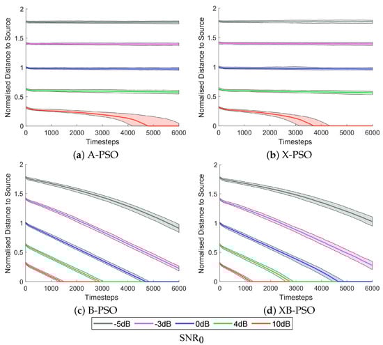 Figure 2 shows the median and 90% percentile ranges of the distance from the source to the CoM of the swarm as function of time for 10, 4, 0, −3 and −5 dB. These results show that A-PSO and X-PSO can only converge when 10 dB, with 4500 and 3400, respectively. The performance of A-PSO and X-PSO are comparable, although the slightly faster convergence of X-PSO does indicate a resilience to low SNR that improves Weakness 1 of A-PSO.
