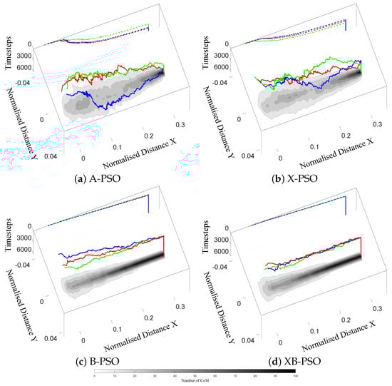 Graphical representation of the routes followed by the CoM of ( = 100) swarms for each method. The image at the bottom plane of each graph shows contours of the number of swarms (CoM) that passed through that location. The red, green and blue lines represent the routes followed by three randomly selected swarms with respect to time. The corresponding dashed lines represent the 2D projections of these routes on the vertical plane (Timesteps vs. Normalised distance X).