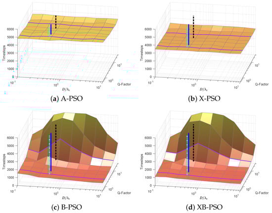 Figure 4 shows the normalised median time to convergence for different values of Q and computed over ( = 100) repeats. Figure 4 shows that the performance of B-PSO and XB-PSO decreases as Q increases and the signal approaches a sinusoid (narrowband), resulting in ambiguities in the lag output of the cross-correlation function, as discussed in Section 3, whereas A-PSO and X-PSO are insensitive. Despite the decrease in performance, XB-PSO still converges faster than B-PSO for all Q values.