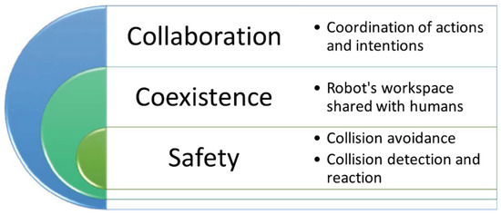 Human–robot collaboration is a broad ideology that is defined on three main principles according to [13]. It is suggested by researchers, such as [25], that HRC systems include not only the sharing of a physical workspace but also a common task. HRC systems can be achieved if the absolute safety of the worker can be guaranteed and accomplished. Accordingly, a framework can be developed that consists of three levels of interaction between the robot and the human worker as shown in Figure 4.