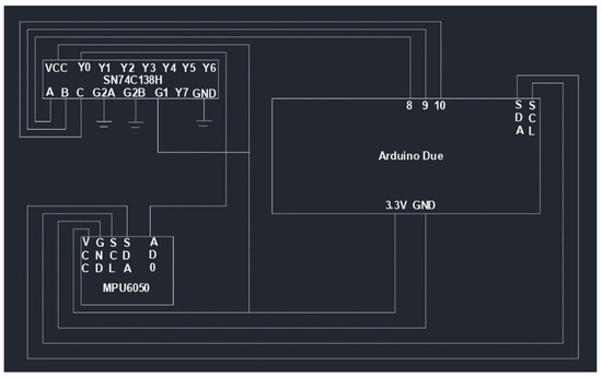 Figure 6 represents a simplified circuitry of the sensory glove system. It shows one MPU6050 and a multiplexer connected to an Arduino© Due. The figure was used to illustrate how the components were connected together through the multiplexers and the Arduino©.