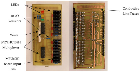 The PCB was designed for the footprint of an Arduino© Due to ensure an easy connection and installation process. The board’s configuration copied the designed circuit, which had been created on the breadboard for the system. Three LEDs were installed to visually validate the programming code. The code logic enabled the selection and deselection of the output lines on the multiplexers.