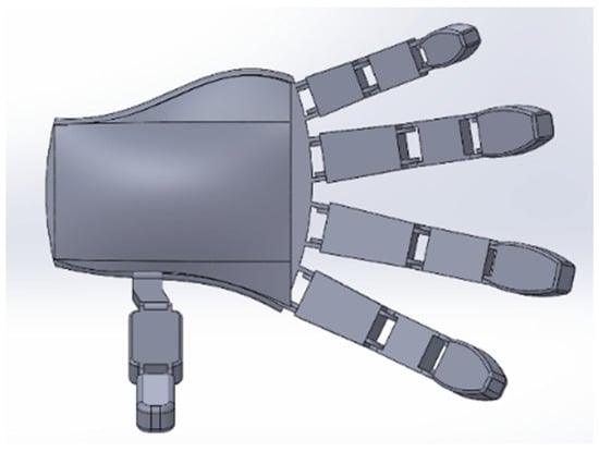 When all the parts of the hand model were developed, the parts were integrated into a hand assembly. All the phalanges were designed with joint connectors to allow for easy assembly and to represent the one DOF joint between each phalange in the finger structure. The final assembly of the human hand model is shown in Figure 8.