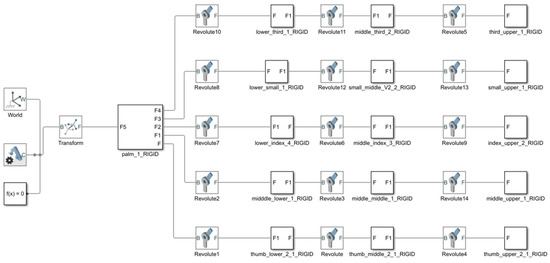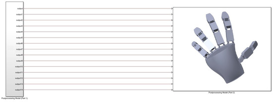 All the data from the sensors were integrated with the respective joints to control the phalanges on the human hand model. This enabled the model to simulate the motion of the sensory glove as it moved. The phalanges were controlled by the input sensor data of the joints. The pitch data were fed into the respective joints as they had one degree of freedom. This can be seen in Figure 13, which shows part 2 of the post-processing model in Simulink©. The final design of the Simulink© hand model is shown in Figure 14. It displays the entire Simulink© hand model and how the post-processing model in Simulink© and the hand model were integrated together.
