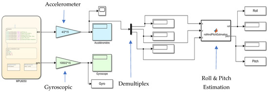 In order to design the control system for the project, Simulink© was used. The control system design started with the data acquisition process. The data acquisition process involved performing multiple operations on sensor data from MPU6050 sensors with the use of a control algorithm. The algorithm would capture the raw data from the sensors and configure it to an acceleration and gyroscopic value for the sensors. Once the data were configured, roll and pitch values for each sensor were calculated and recorded. A simplified version of the process can be seen in Figure 10 as it illustrates the data acquisition and configuration process of the sensor’s data.