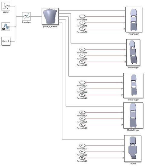 The Simscape multibody tool modelled the phalanges as links. The joints between adjacent phalanges were modelled as one DOF revolute joint. Therefore, the package created a single kinematic chain system controlled through torque or motion inputs of each revolute joint. This was ideal as research has shown that the best way to model the human hand is as a straight chain link between the wrist and fingertips [30]. The model was designed to be controlled through motion inputs to simulate the motion of the human hand model. Figure 9 shows the model of the human hand created using the Simscape multibody tool in Simulink©.