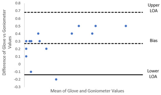 Therefore, the researcher used this method to determine if the two datasets were statistically comparable. Figure 17 shows a Bland–Altman agreement graph that used the theory from the ‘limit of agreement’ on the relative angular values from the index finger. The graph showed that 95% of the differences lay within the 95% limits. Therefore, the results of the accuracy test showed that the sensory glove was an effective and accurate solution to determine the orientation of the human hand.