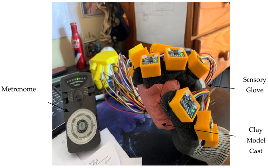 Setup of Dynamic Range Test with a metronome, sensory glove and clay model cast.