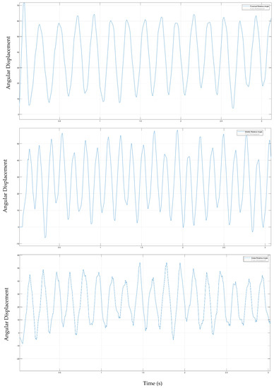During the test, the relative angles of the joints between the adjacent phalanges were measured. All fingers performed a motion that experienced little to no abduction motion. In the beginning of the test, the researcher’s hand was required to be flat and perpendicular to the surface of the earth. A procedure was designed to carry out the test. This procedure included the user operating the glove between two predetermined orientations at the desired speed. This allowed the readings from the sensory glove to be recorded and tabulated to validate and verify its performance. For the purpose of the test, the motion of the index finger was analysed. This was conducted to perform an extensive analysis of the responsive nature of the system. The results are shown in Figure 19.