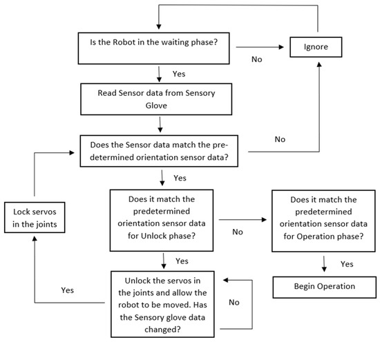 Ten trials were conducted to confirm that the algorithm unlocked the robot joints when in a predetermined orientation and if the algorithm resumed the robot’s operation when in a predetermined orientation. Table 3 below shows the results of the test and the efficiency of the sensory glove.