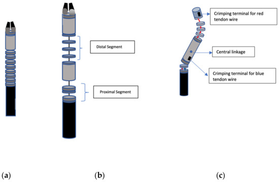 Example of the structure of a snake-like robot. (a) Single segment with individual links; (b) double segment with joints linked to a median linkage; (c) internal view of the continuum structure showing tendon wires guided through terminals (adapted from [92]).