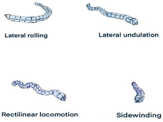 The different types of snake locomotion used during the control of the robotic system, including lateral rolling, lateral undulation, rectilinear locomotion and sidewinding.
