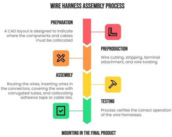 Wire harnesses join cables from different electrical equipment. Their assembly has not changed over time, even with the progress of manufacturing technology [1,2]. The wire harness assembly process is a complicated manufacturing activity, which is becoming more complex because of the evolving nature of mechatronic and electronic products that require more connectors, sensors, controllers, communication networking, etc. Moreover, most of their assembly tasks are done manually [2,3]. Heisler et al. [4] indicated that 90% of the wire harness assembly process tasks are done manually. The steps needed to manufacture a generic wire harness are presented in Figure 1. For the scope of this work, the process only focuses on manufacturing a wire harness, including tasks such as strapping its different wires to a supporting structure and adding plugs to its wires.