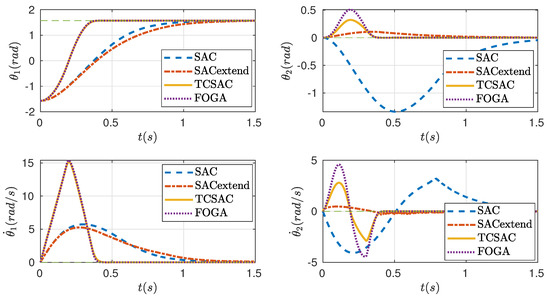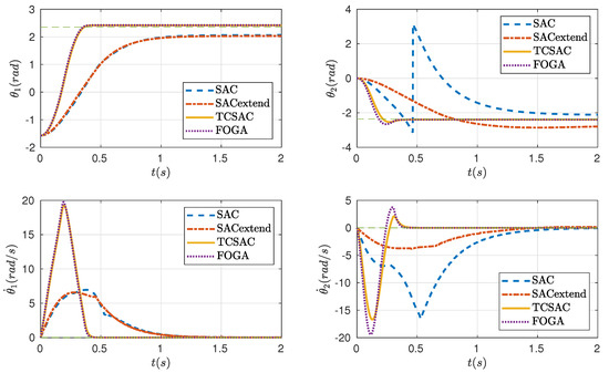 In this section, we want to analyze the performance of the methods in the case of any arbitrary desired position. In this case, the controller has to compensate the gravitational force, which is zero if the robot is at the upright position (equilibrium point). This highlights the role of the target constraint in TC-SAC and FOGA in terms of convergence. The desired position is set to be and other parameters are set to be the same as in the case of the upright position. The simulation is run for and the result is shown in Figure 4. It can be seen that TC-SAC and FOGA quickly converge to the desired position in approximately , while both SAC and the extended SAC methods cannot converge to the desired position in and . These offsets appear in any desired position that is not the equilibrium point. Therefore, TC-SAC and FOGA are preferable for reaching/tracking tasks, even though the computation time is longer.