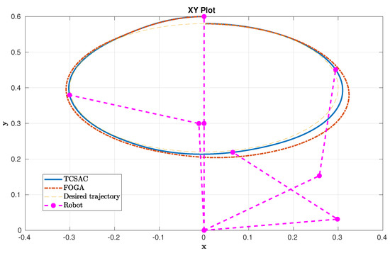 Moving one step further, we evaluate the methods in a trajectory tracking task. Since SAC and the extended SAC are incapable of reaching an arbitrary position, they are excluded from this task. The trajectory is set to be an ellipse where the radii along the x-axis and y-axis are 0.3 m and 0.18 m, respectively. For the sake of simplicity, the robot follows the ellipse with a constant velocity and the whole ellipse takes to finish. The starting position is set to be upright. In this simulation, the weighting matrices are set to be and . Other parameters remain the same. Figure 5 shows the tracking performance between TC-SAC and FOGA in the XY graph, while Figure 6 shows this in each state of the robot. Figure 5 also illustrates the configuration of the robot at different positions along the ellipse.