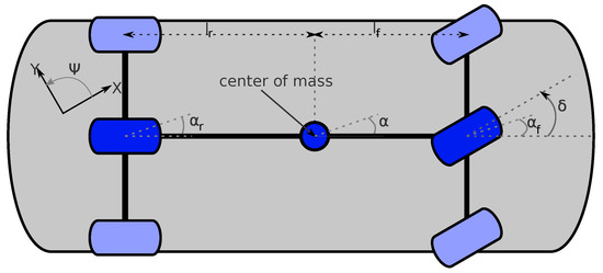 with the drag coefficient , the density of the air and the front surface A of the car and the inertia of the car. in (A2)–(A4) are the lateral tire forces obtained by using Pacejka’s magic tire formula