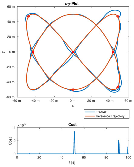 The remainder of this work is structured as follows. In Section 2, the design of the proposed method is outlined: first, the trajectory tracking problem is formulated in Section 2.1, and then, in Section 2.2, we introduce the basic concept of TC-SAC, as well as the detailed mathematical formulation of the algorithm. Then, the results of the simulation with TC-SAC are given in Section 3. We discuss the stability proof of TC-SAC in Section 4 and conclude our work with the discussion and outlook in Section 5.