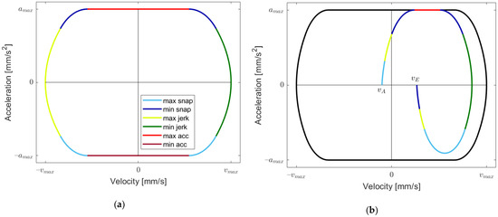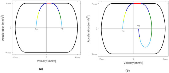 As is conducted in [28], we distinguish between two major cases depending on whether or not the maximum jerk is reached when applying the maximum and minimum snap in order to get from acceleration zero to maximal acceleration. For the convenience of the reader, we briefly summarize some of the results developed in [28]. The maximum jerk is not reached (Case I) if and only if holds. We term the other case as Case II in the sequel. We describe a point in the velocity–acceleration plane by a triple , where the third “coordinate” provides the jerk value of the point . A straightforward computation (cf. [28]) yields the time needed for going from to in the velocity–acceleration plane by accelerating and decelerating as much as possible (see Figure 3a), abbreviated as . The results need further sub-cases and are given in Table 2.