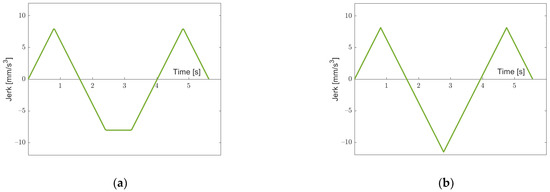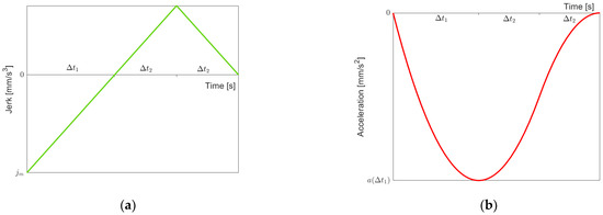 In [28], this consideration is actually sufficient, since it is assumed that when the velocity reaches its extremal value , then the jerk goes back to zero, such that the overall motion can be split up into two parts, from to and from to . This is depicted in Figure 3b.